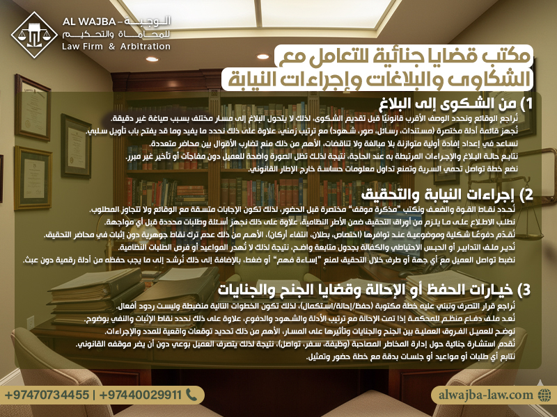 في مكتب الوجبة للمحاماة والتحكيم Al Wajbah Law and Arbitration Office نعمل بمنهج دفاعي منظم يوازن بين السرعة والدقة مع احترام سرية البيانات. علاوة على ذلك نُقدّم استشارة جنائية عملية تساعدك على اتخاذ قرار واعٍ في كل مرحلة قبل أي توقيع أو إفادة أو مواجهة.